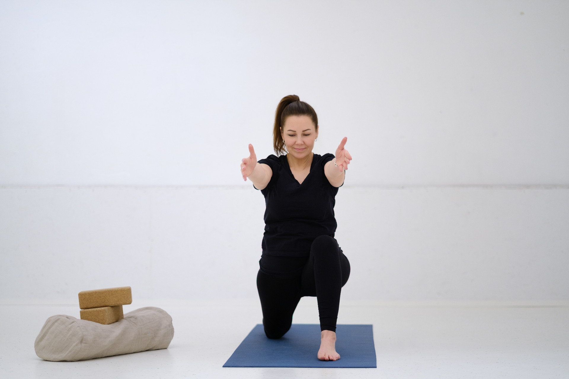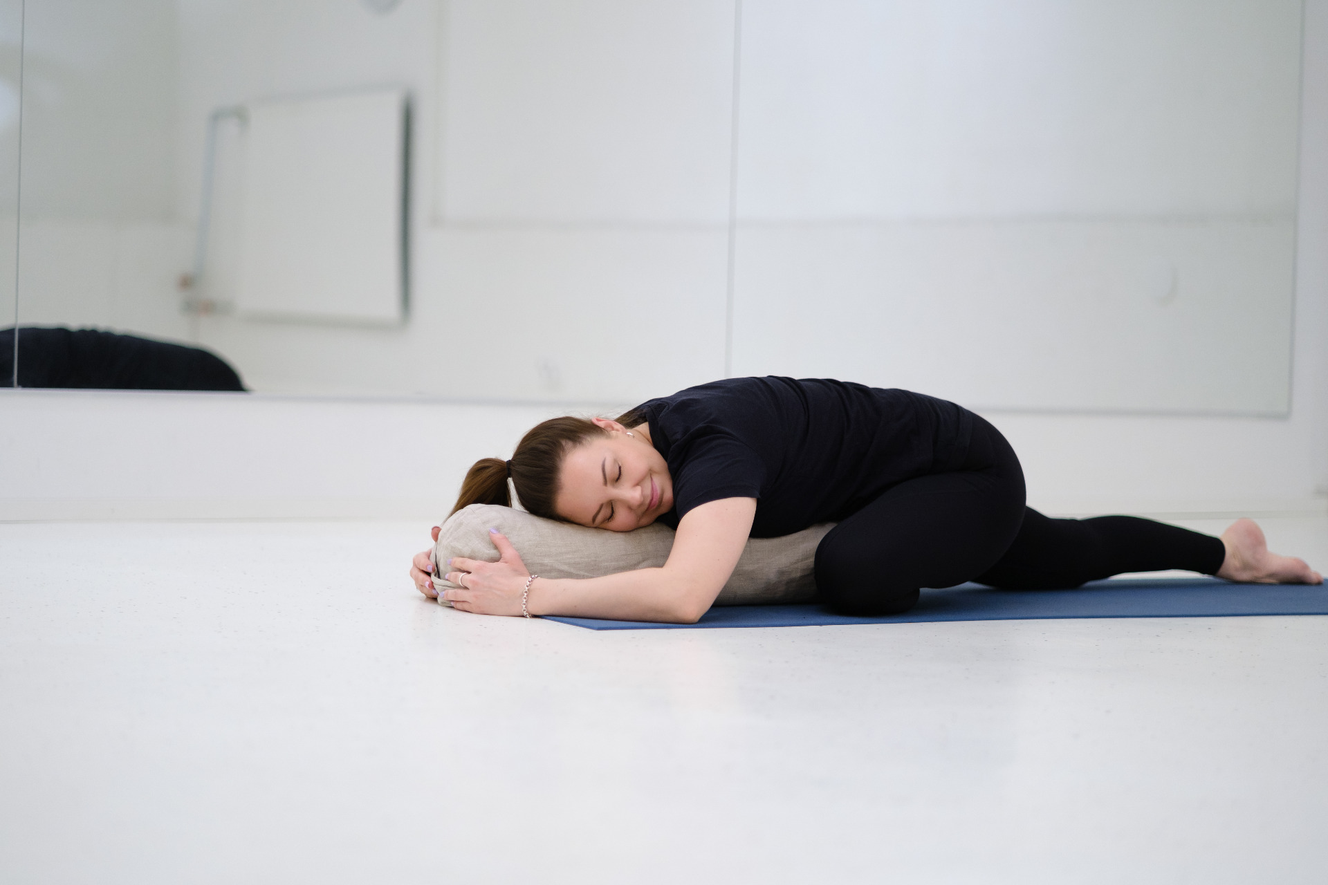 Tunnilla käytetään salilta löytyviä apuvälineitä, kuten bolsterityynyjä ja joogatiiliä.