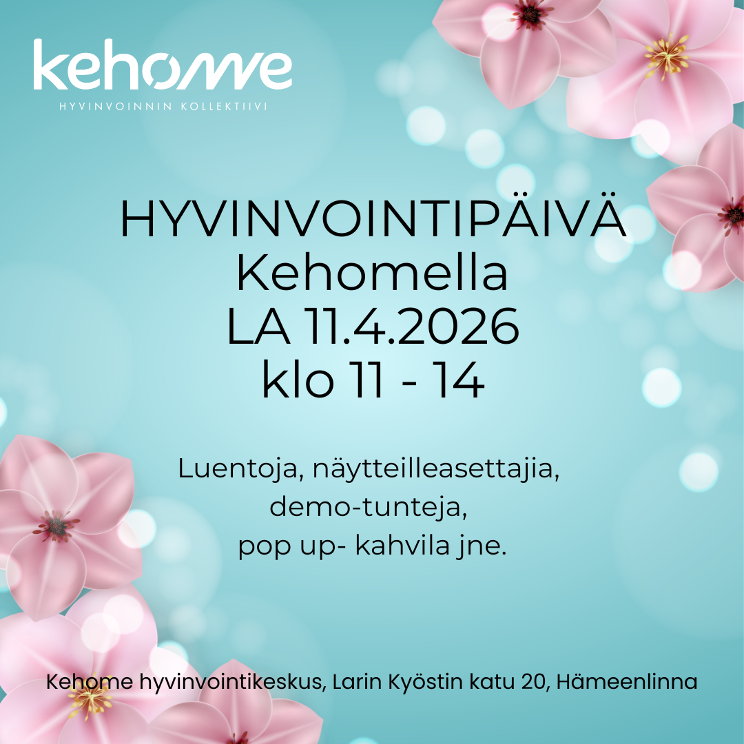 Kehome Hyvinvointikeskus järjestää lauantaina 11.4. klo 11- 14 maksuttoman hyvinvointipäivän, joka kokoaa saman katon alle monipuolisen kattauksen luentoja, kehonhuoltoa ja hyvinvoinnin asiantuntijoita. Tapahtuma on kaikille avoin ja tarjoaa matalan kynnyksen mahdollisuuden tutustua omaa arkea tukeviin hyvinvointikeinoihin.